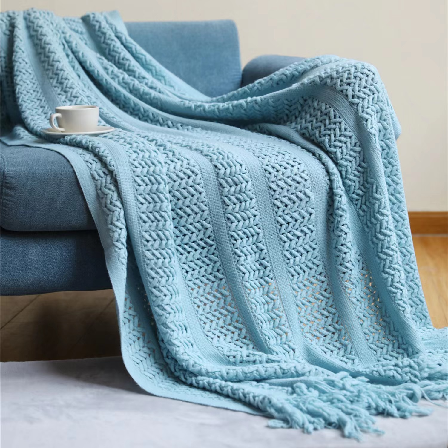 Dette strikkede pleddet er et mykt og varmt pledd i enkel skandinavisk design. Pleddet fås i størrelsen 127x172cm og 130x230cm, og finnes i flere vakre farger.