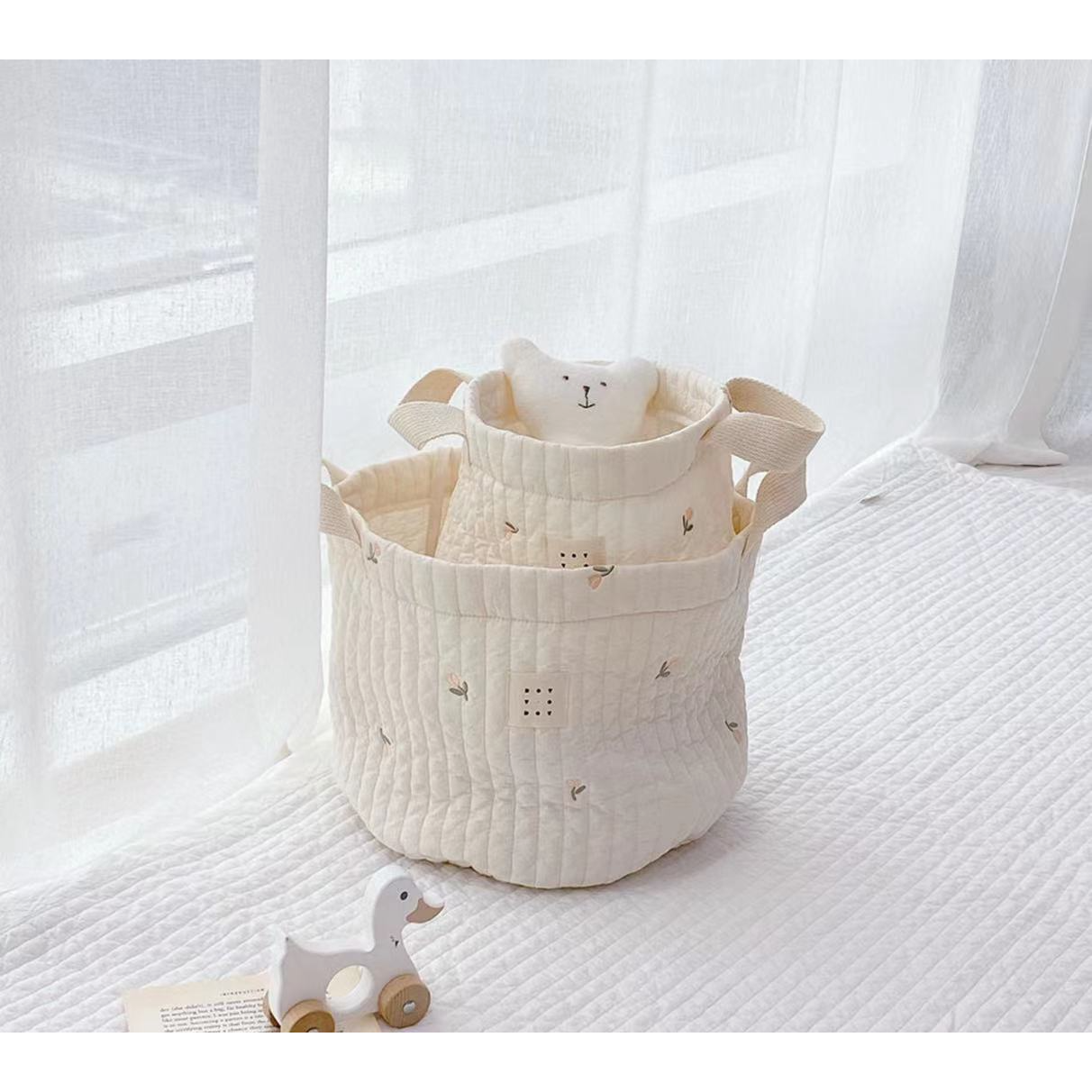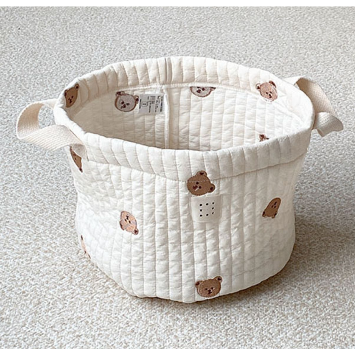 Søt oppbevaringskurv i mykt hvitt stoff med bamse-mønster